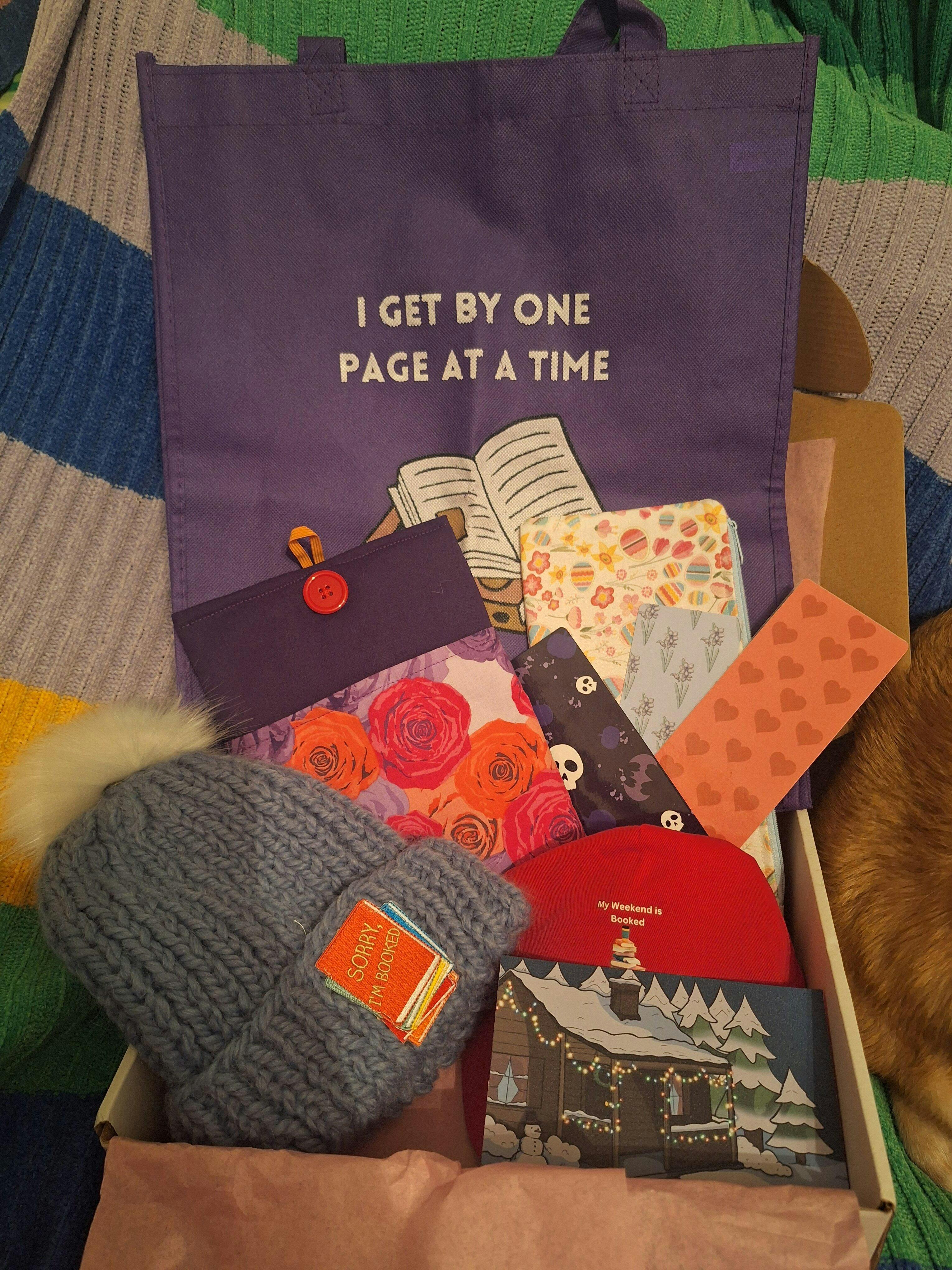 With only FOUR of these large end-of-line stock/slight seconds bundles available, get yours before it sells out! This bundle includes a Kindle sleeve, tote bag, cap, two bookmarks, a pencil case OR bookmark pouch,and a bobble hat OR beanie!